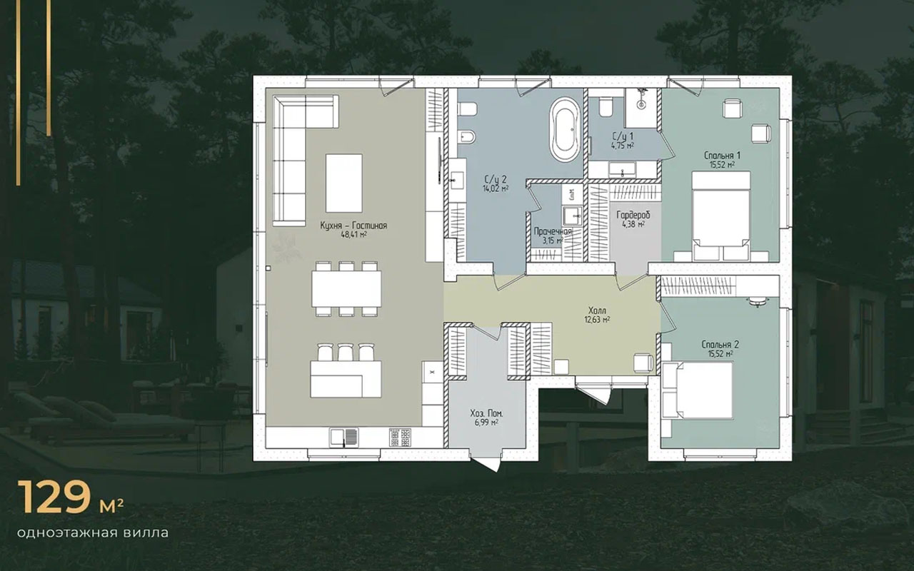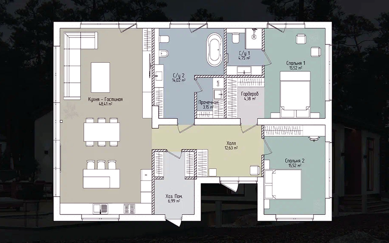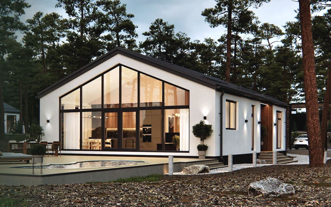 Вилла представляет собой современное архитектурное решение в стиле минимализм с элементами скандинавского дизайна, гармонично вписанное в лесную природу. Дом сочетает простоту форм, функциональность и эстетическую выразительность, создавая ощущение уюта и единения с природой. Главная особенность — огромная панорамная стена из стекла на передней стороне дома. Это позволяет максимально использовать естественный свет и открывает живописный вид на окружающий лес.