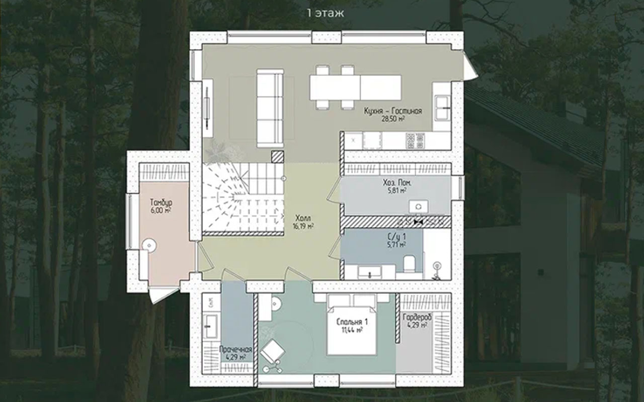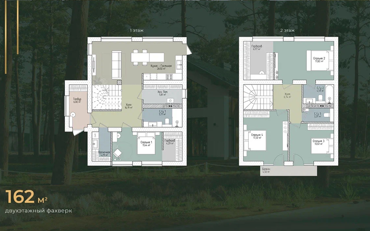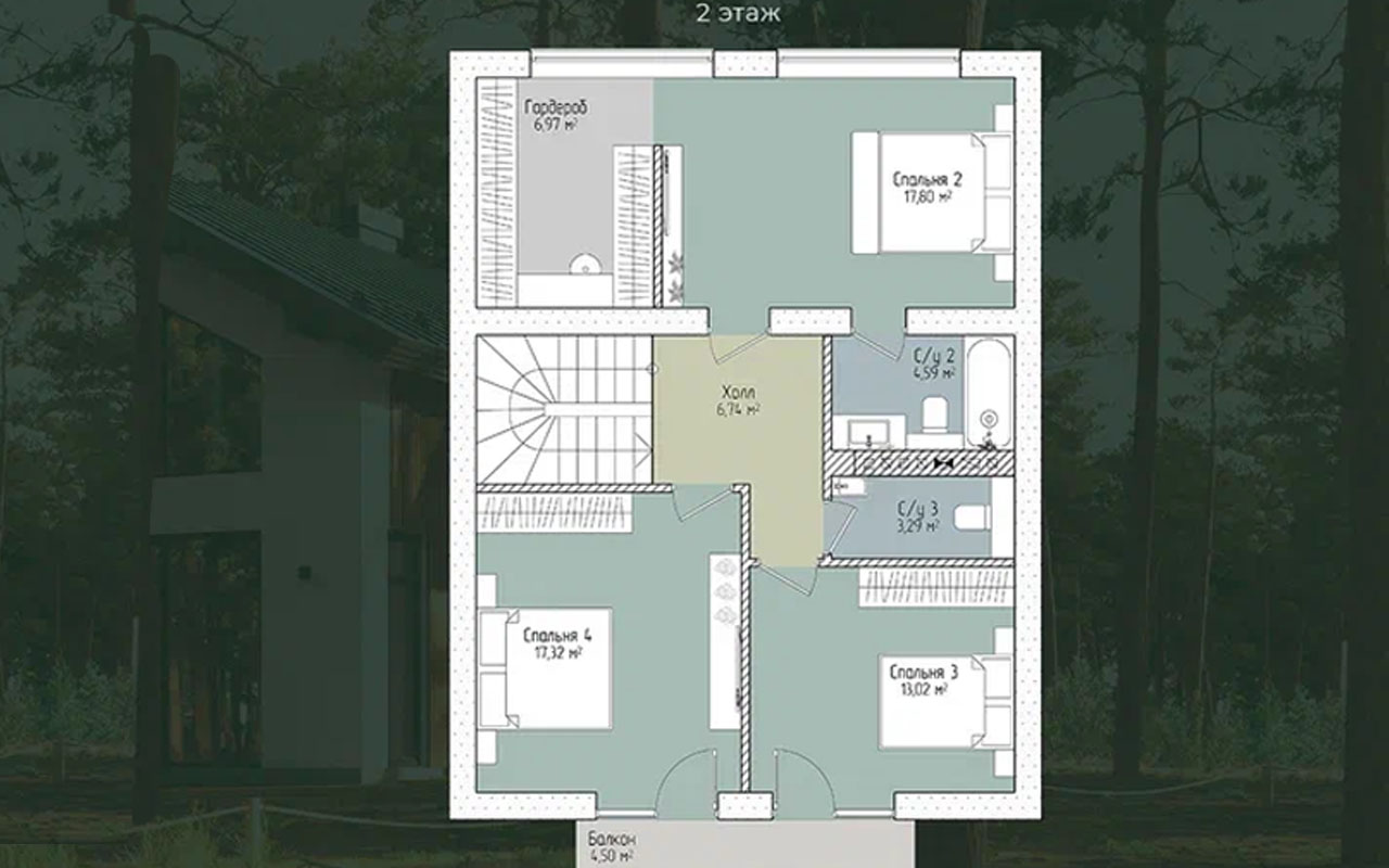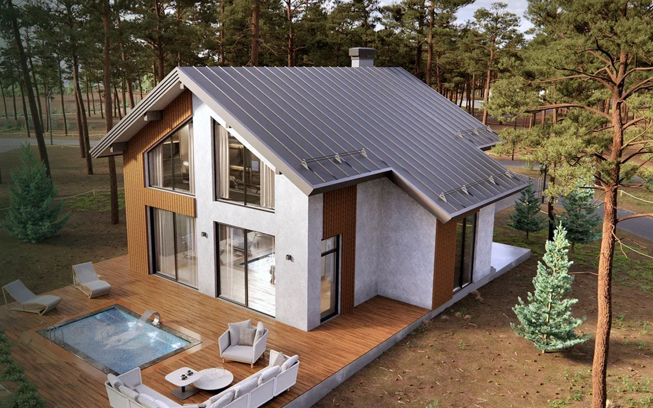 Двухэтажный дом в стиле современного фахверка сочетает традиционные архитектурные мотивы с актуальными материалами и технологиями: его фасад выделен вертикальными деревянными панелями, имитирующими несущий каркас, на фоне светлой штукатурки, что придаёт зданию уютный и экологичный облик. Крутая двускатная крыша из серого металлического профилированного листа гармонично вписывается в лесной пейзаж, а большие панорамные окна на первом и втором этажах обеспечивают максимальное проникновение света и открывают вид на окружающую природу. Просторная деревянная терраса с зоной отдыха, создаёт атмосферу релаксации и единения с природой.