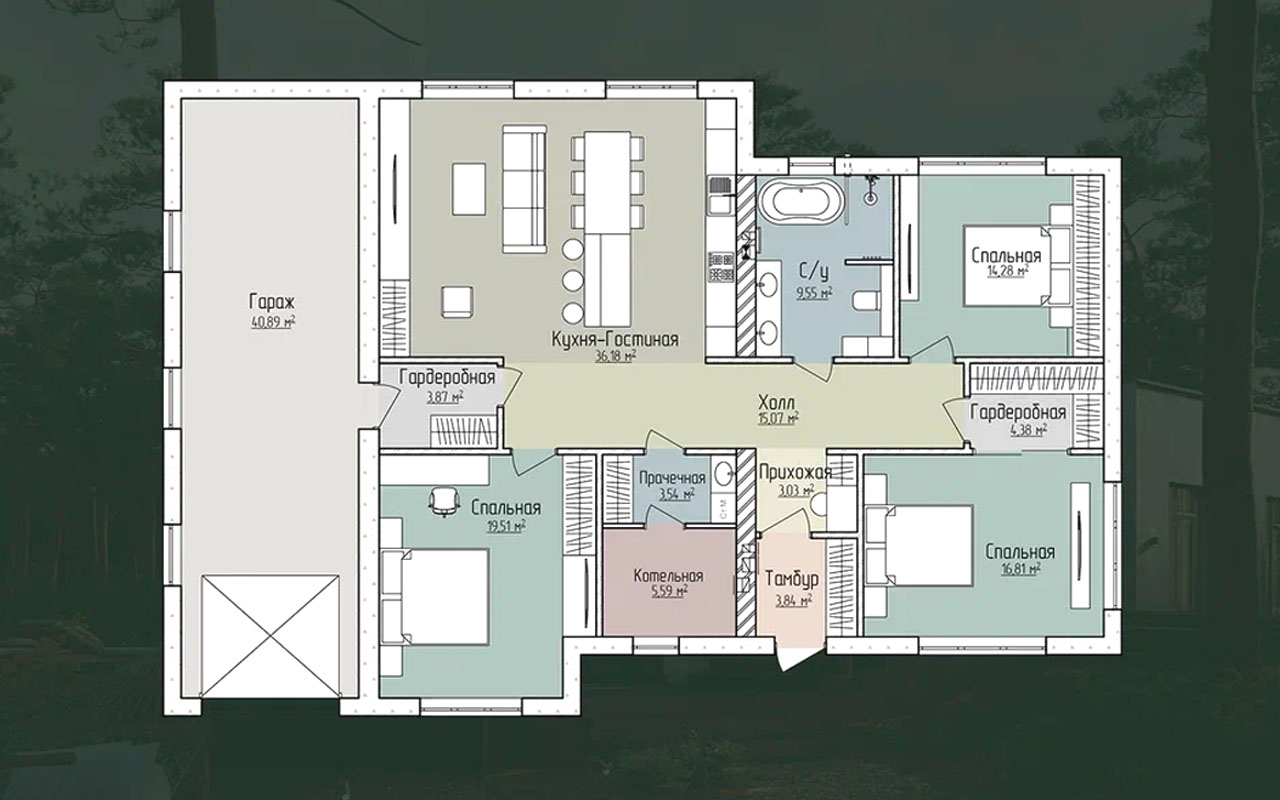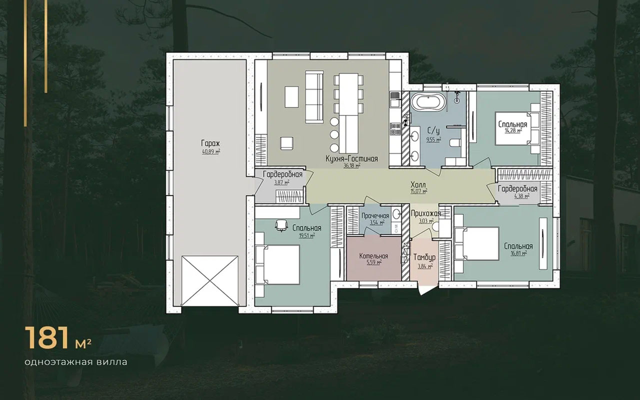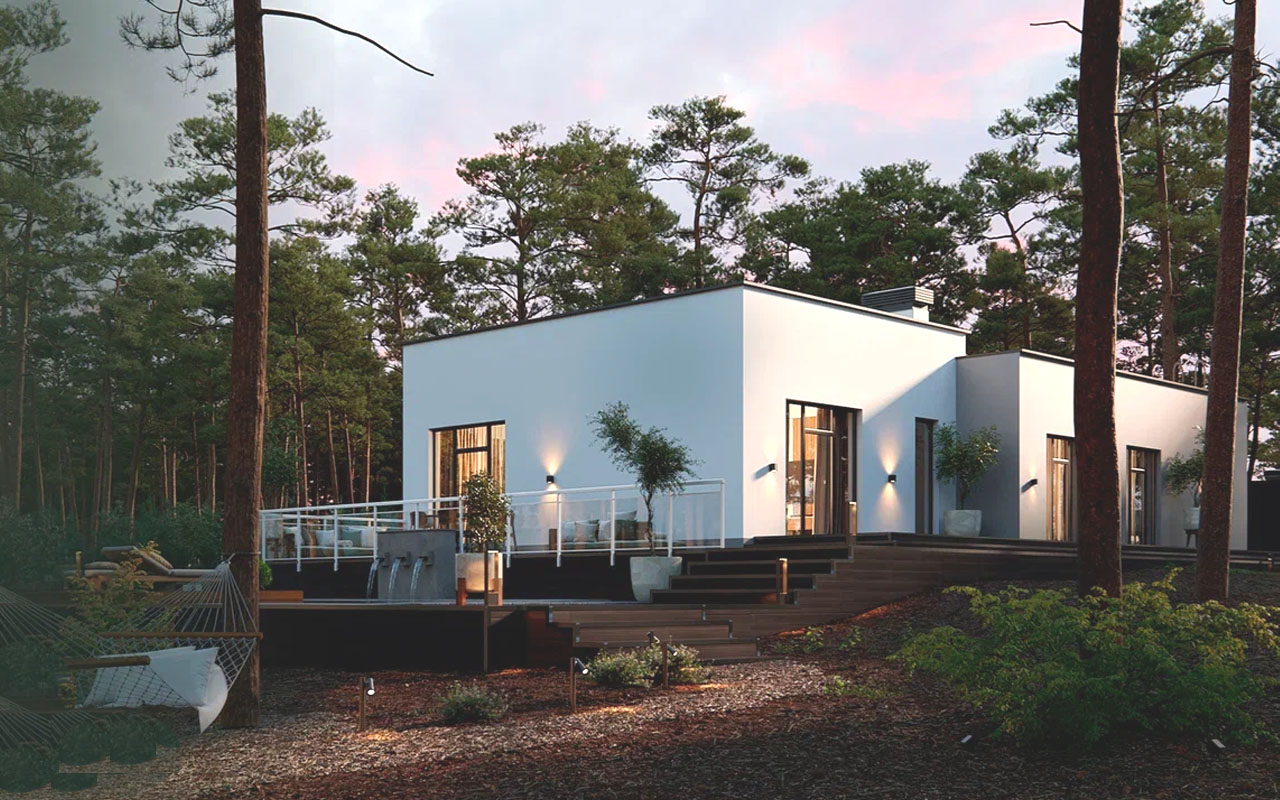 Современная одноэтажная вилла в стиле минимализма. Дом выделяется чистыми геометрическими формами, белыми фасадами и строгой архитектурной композицией, состоящей из нескольких объёмов, слегка смещённых относительно друг друга. Большие панорамные окна с тёмными рамами обеспечивают максимальное проникновение света и открывают вид на окружающую природу, создавая ощущение открытости и простора.