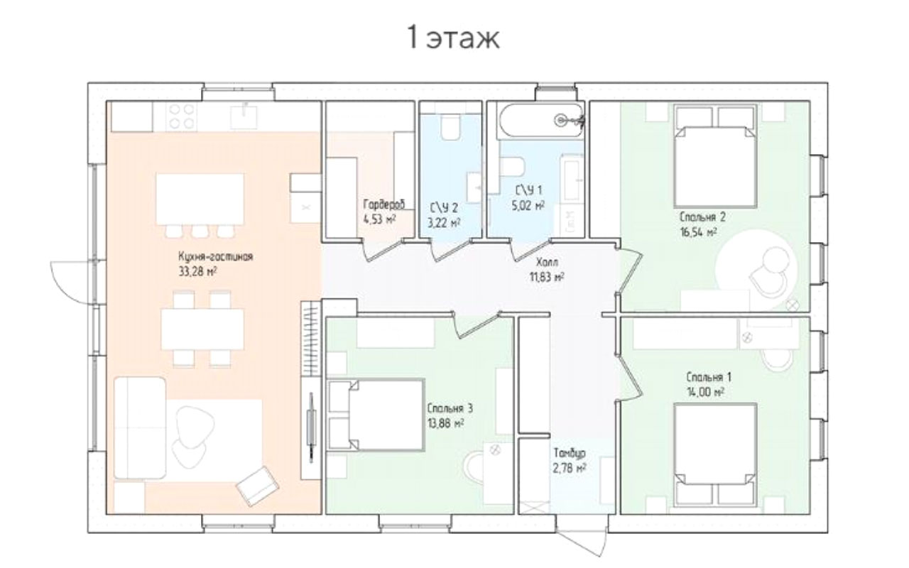 Одноэтажный дом для семьи с детьми из газобетонного блока. Свободная планировка. Участок 6-14 соток.